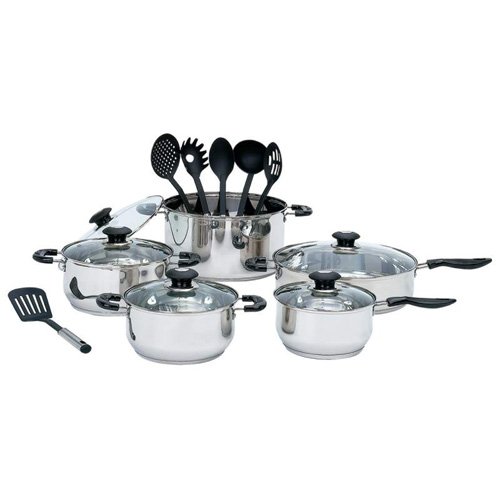 - Set includes: 2.2qt covered saucepan, 3qt covered saucepan, 4qt covered saucepan, 9qt covered stock pot, 12-1/2" covered frypan, solid spoon, slotted spoon, slotted spatula, ladle, spaghetti spoon, and strainer.